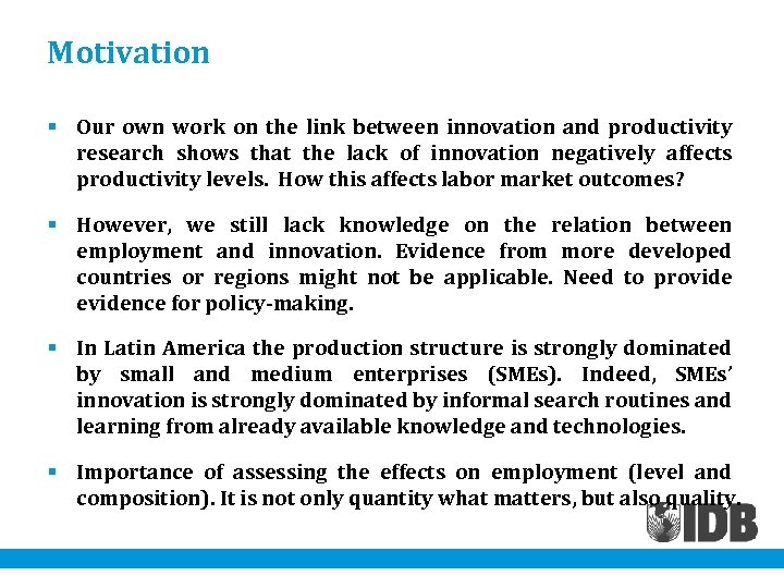 Motivation § Our own work on the link between innovation and productivity research shows that the lack of innovation negatively affects productivity levels. How this affects labor market outcomes? § However, we still lack knowledge on the relation between employment and innovation. Evidence from more developed countries or regions might not be applicable. Need to provide evidence for policy-making. § In Latin America the production structure is strongly dominated by small and medium enterprises (SMEs). Indeed, SMEs’ innovation is strongly dominated by informal search routines and learning from already available knowledge and technologies. § Importance of assessing the effects on employment (level and composition). It is not only quantity what matters, but also quality.