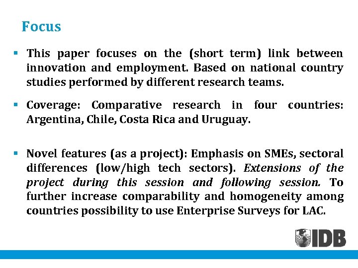 Focus § This paper focuses on the (short term) link between innovation and employment. Based on national country studies performed by different research teams. § Coverage: Comparative research in four countries: Argentina, Chile, Costa Rica and Uruguay. § Novel features (as a project): Emphasis on SMEs, sectoral differences (low/high tech sectors). Extensions of the project during this session and following session. To further increase comparability and homogeneity among countries possibility to use Enterprise Surveys for LAC.