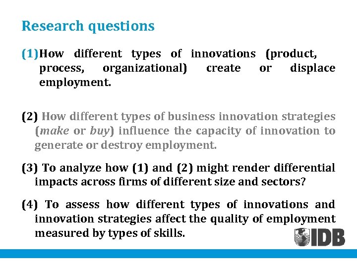Research questions (1) How different types of innovations (product, process, organizational) create or displace employment. (2) How different types of business innovation strategies (make or buy) influence the capacity of innovation to generate or destroy employment. (3) To analyze how (1) and (2) might render differential impacts across firms of different size and sectors? (4) To assess how different types of innovations and innovation strategies affect the quality of employment measured by types of skills.