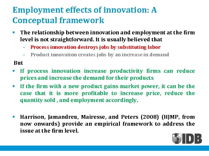 Employment effects of innovation: A Conceptual framework § The relationship between innovation and employment at the firm level is not straightforward. It is usually believed that – Process innovation destroys jobs by substituting labor – Product innovation creates jobs by an increase in demand But § If process innovation increase productivity firms can reduce prices and increase the demand for their products § If the firm with a new product gains market power, it can be the case that it is more profitable to increase price, reduce the quantity sold , and employment accordingly. § Harrison, Jamandreu, Mairesse, and Peters (2008) (HJMP, from now onwards) provide an empirical framework to address the issue at the firm level.