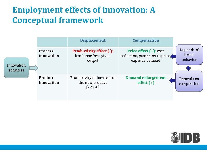Employment effects of innovation: A Conceptual framework Displacement Compensation Process Innovation Productivity effect (-): less labor for a given output Price effect (+): cost reduction, passed on to price, expands demand Depends of firms’ behavior Product Innovation Productivity differences of the new product (- or +) Demand enlargement effect (+) Depends on competition Innovation activities