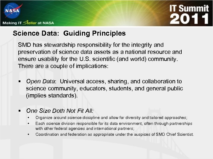Science Data: Guiding Principles SMD has stewardship responsibility for the integrity and preservation of science data assets as a national resource and ensure usability for the U. S. scientific (and world) community. There a couple of implications: § Open Data: Universal access, sharing, and collaboration to science community, educators, students, and general public (implies standards). § One Size Doth Not Fit All: • • • Organize around science discipline and allow for diversity and tailored approaches; Each science division responsible for its data environment, often through partnerships with other federal agencies and international partners; Coordination and federation as appropriate under the auspices of SMD Chief Scientist.