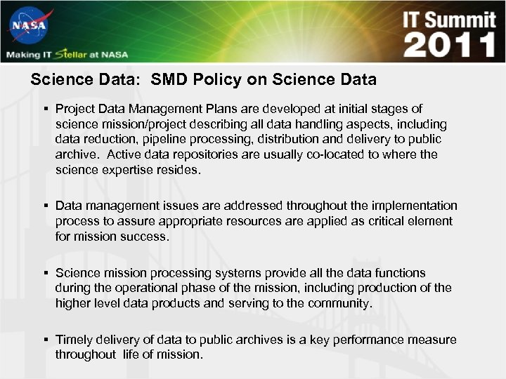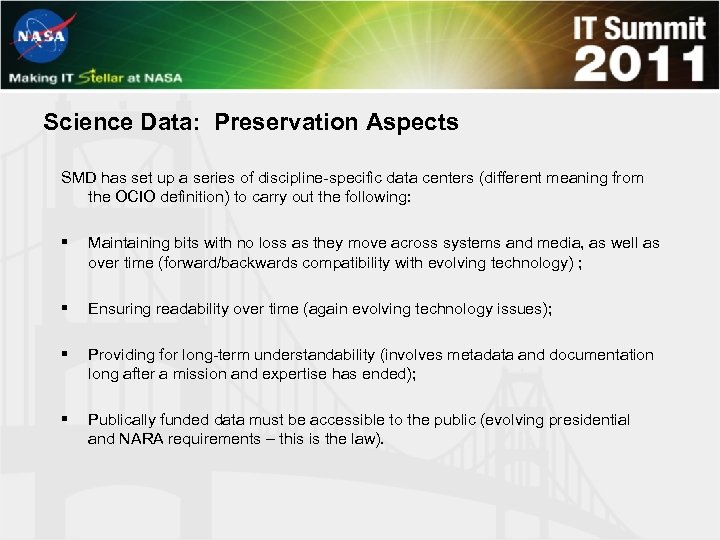 Science Data: Preservation Aspects SMD has set up a series of discipline-specific data centers (different meaning from the OCIO definition) to carry out the following: § Maintaining bits with no loss as they move across systems and media, as well as over time (forward/backwards compatibility with evolving technology) ; § Ensuring readability over time (again evolving technology issues); § Providing for long-term understandability (involves metadata and documentation long after a mission and expertise has ended); § Publically funded data must be accessible to the public (evolving presidential and NARA requirements – this is the law).