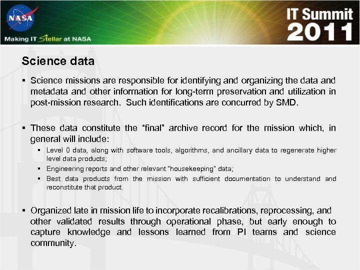 Science data § Science missions are responsible for identifying and organizing the data and metadata and other information for long-term preservation and utilization in post-mission research. Such identifications are concurred by SMD. § These data constitute the “final” archive record for the mission which, in general will include: § Level 0 data, along with software tools, algorithms, and ancillary data to regenerate higher level data products; § Engineering reports and other relevant “housekeeping” data; § Best data products from the mission with sufficient documentation to understand reconstitute that product. § Organized late in mission life to incorporate recalibrations, reprocessing, and other validated results through operational phase, but early enough to capture knowledge and lessons learned from PI teams and science community.