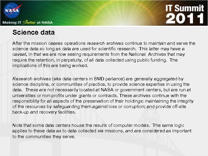 Science data After the mission ceases operations researchives continue to maintain and serve the science data so long as data are used for scientific research. This latter may have a caveat, in that we are now seeing requirements from the National Archives that may require the retention, in perpetuity, of all data collected using public funding. The implications of this are being worked. Researchives (aka data centers in SMD parlance) are generally aggregated by science discipline, or communities of practice, to provide science expertise in using the data. These are not necessarily located at NASA or government centers, but are run at universities or non-profits under grants or contracts. These archives continue with the responsibility for all aspects of the preservation of their holdings: maintaining the integrity of the resources by safeguarding them against loss or corruption; and provide off-site back-up and recovery facilities. Note that some data centers house the results of computer models. The same logic applies to these data as to data collected via missions, and are considered as important to the communities they serve.