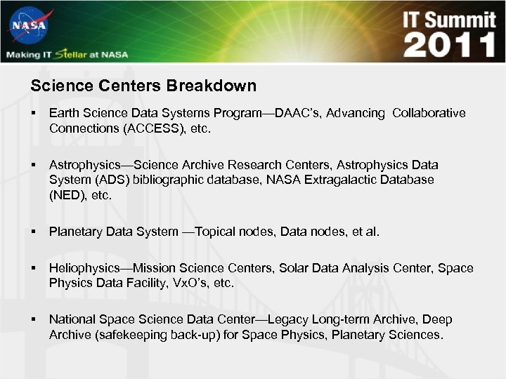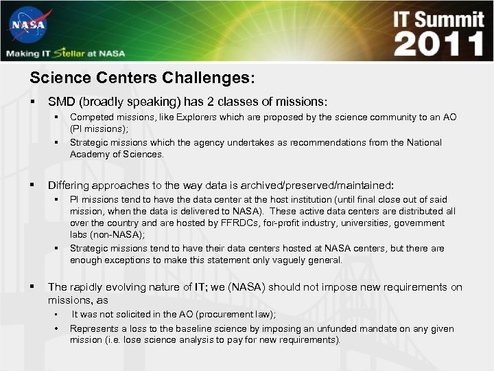 Science Centers Challenges: § SMD (broadly speaking) has 2 classes of missions: § § § Differing approaches to the way data is archived/preserved/maintained: § § § Competed missions, like Explorers which are proposed by the science community to an AO (PI missions); Strategic missions which the agency undertakes as recommendations from the National Academy of Sciences. PI missions tend to have the data center at the host institution (until final close out of said mission, when the data is delivered to NASA). These active data centers are distributed all over the country and are hosted by FFRDCs, for-profit industry, universities, government labs (non-NASA); Strategic missions tend to have their data centers hosted at NASA centers, but there are enough exceptions to make this statement only vaguely general. The rapidly evolving nature of IT; we (NASA) should not impose new requirements on missions, as • It was not solicited in the AO (procurement law); • Represents a loss to the baseline science by imposing an unfunded mandate on any given mission (i. e. lose science analysis to pay for new requirements).