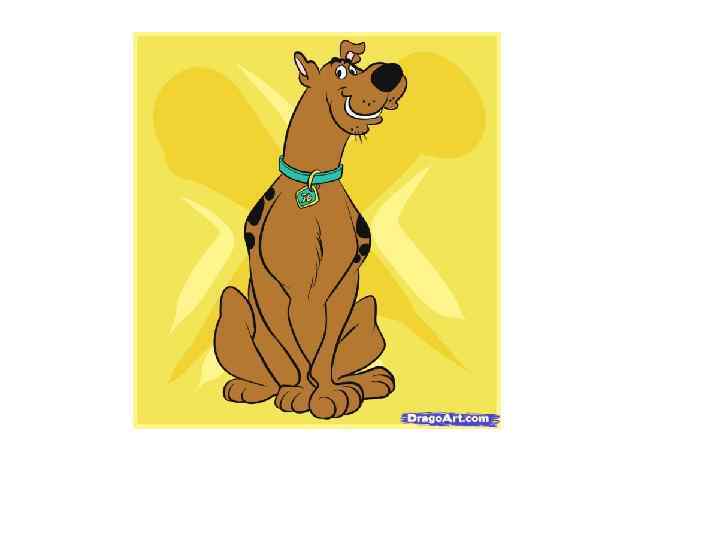 Скуби ду Скуби — коричневый пёс с несколькими чёрными пятнами на верхней части тела. У него чёрный нос. На шее Скуби носит синий ошейник с бляшкой в виде ромба. На бляшке выгравированы две латинские, жёлтые буквы «SD» (его инициалы). Имеет по четыре пальца на каждой лапе. Порода Скуби-Ду — немецкий дог. Ивао Такамото (создатель Скуби-Ду) позднее объяснил, что, прежде чем он разработал внешность пса, он разговаривал с заводчиком немецких догов, который рассказал ему о желательной внешности собак. Такамото затем сделал Скуби как противоположность этому описанию. Он сказал: «Я решил пойти в обратном и дал собаке горб спины, кривые ноги, большой подбородок» .