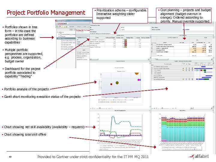 Project Management – Drill-down to one of the alternative solutions • Gantt chart showing the project and the different skills required during the project phases if the project is implemented with this solution • Business plan for the project if implemented with this solution • Gantt chart showing the applications of the solutions along with the technologies on which those applications are dependent. This exposes life-cycle conflicts. • A list of changes to the architecture to be executed in order to implement this solution 9 Provided to Gartner under strict confidentiality for the IT PM MQ 2011