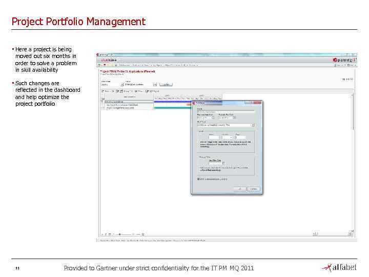 Project Portfolio Management • Prioritization scheme – configurable. Interactive weighting-slider supported • Portfolios shown in tree form – in this case the portfolios are defined according to business capabilities • Multiple portfolio perspectives are supported, e. g. process, organization, budget owner • Dashboard for the project portfolio associated to capability “Trading” • Portfolio analysis of the projects • Gantt chart monitoring execution status of the projects • Chart showing net skill availability (availability – requests) • Chart showing total skill offers 10 Provided to Gartner under strict confidentiality for the IT PM MQ 2011 • Cost planning – projects and budget alignment (budget overrun in orange). Ordered according to priority. Manual override supported.