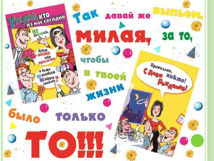 Будь всегда краси вой и беспечной, К чертy все дома шние дела! Чтоб мужчинa д умал каждый вс тречный: "Ах, какая женщ ина прошла!" И про макияж н е забывай, конеч но, Даже если ты ид ешь домой, Чтоб мужчинa д умал каждый вс тречный: "Ах, какая дама, Боже мой!" И еще один совет известный: Иногда рюмашеч ку прими, Чтоб мужчинa д умал каждый вс тречный: "Ах, какая баба, ч ерт возьми!” й, тно бо безза ной, й, ливо и улет ьной, т л счас ичной , сти ьной, т Будь ой па Сим нтересн мобил ей, руга, , и ущ йи елаю, под Ж ркой амодно будь зов !))) ной, Я ззабот р ей й, , ям! жизни бе Ульт аняще ой лучш рытвин м хабов, г а е знать у Будь ей подру Н его полет ей высш ям! удь птиц И мо Б м воробь ть На завис мелки