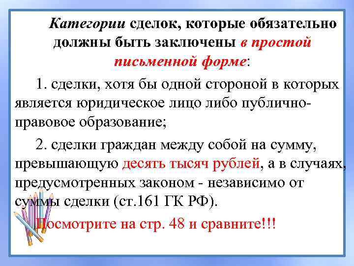 Категории сделок, которые обязательно должны быть заключены в простой письменной форме: 1. сделки, хотя бы одной стороной в которых является юридическое лицо либо публично правовое образование; 2. сделки граждан между собой на сумму, превышающую десять тысяч рублей, а в случаях, предусмотренных законом независимо от суммы сделки (ст. 161 ГК РФ). Посмотрите на стр. 48 и сравните!!!