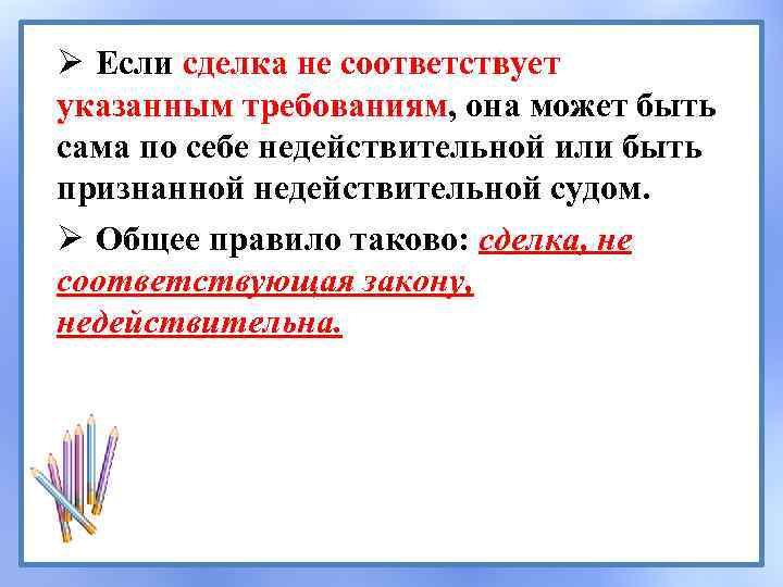 Ø Если сделка не соответствует указанным требованиям, она может быть сама по себе недействительной или быть признанной недействительной судом. Ø Общее правило таково: сделка, не соответствующая закону, недействительна.