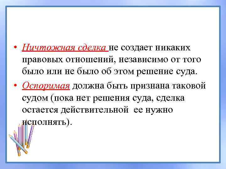 • Ничтожная сделка не создает никаких правовых отношений, независимо от того было или не было об этом решение суда. • Оспоримая должна быть признана таковой судом (пока нет решения суда, сделка остается действительной ее нужно исполнять).