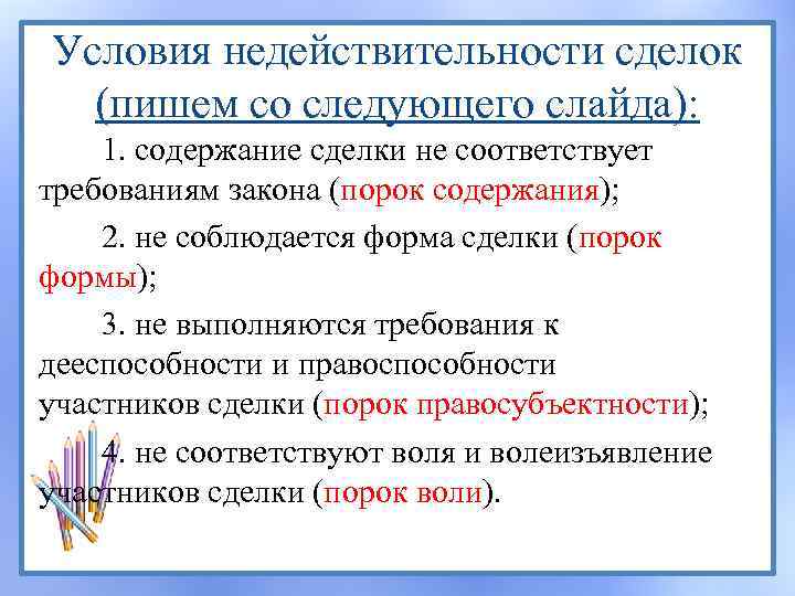 Условия недействительности сделок (пишем со следующего слайда): 1. содержание сделки не соответствует требованиям закона (порок содержания); 2. не соблюдается форма сделки (порок формы); 3. не выполняются требования к дееспособности и правоспособности участников сделки (порок правосубъектности); 4. не соответствуют воля и волеизъявление участников сделки (порок воли).
