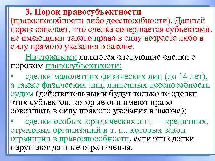 3. Порок правосубъектности (правоспособности либо дееспособности). Данный порок означает, что сделка совершается субъектами, не имеющими такого права в силу возраста либо в силу прямого указания в законе. Ничтожными являются следующие сделки с пороком правосубъектности: • сделки малолетних физических лиц (до 14 лет), а также физических лиц, лишенных дееспособности судом (действительными будут только те сделки этих субъектов, которые они имеют право совершать в силу прямого указания в законе); • сделки особых юридических лиц — кредитных, страховых организаций и т. п. , которых закон ограничил в правоспособности, если эти сделки нарушают данные ограничения.