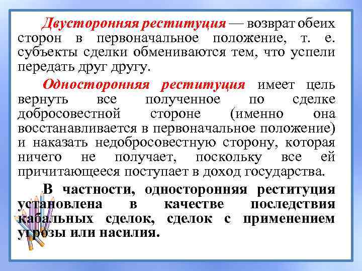 Двусторонняя реституция — возврат обеих сторон в первоначальное положение, т. е. субъекты сделки обмениваются тем, что успели передать другу. Односторонняя реституция имеет цель вернуть все полученное по сделке добросовестной стороне (именно она восстанавливается в первоначальное положение) и наказать недобросовестную сторону, которая ничего не получает, поскольку все ей причитающееся поступает в доход государства. В частности, односторонняя реституция установлена в качестве последствия кабальных сделок, сделок с применением угрозы или насилия.