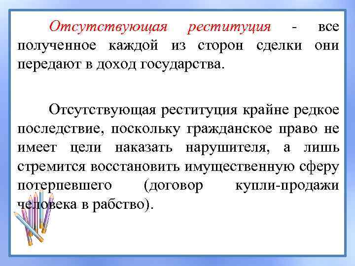 Отсутствующая реституция все полученное каждой из сторон сделки они передают в доход государства. Отсутствующая реституция крайне редкое последствие, поскольку гражданское право не имеет цели наказать нарушителя, а лишь стремится восстановить имущественную сферу потерпевшего (договор купли продажи человека в рабство).