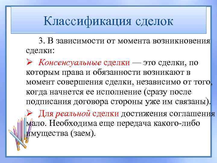Классификация сделок 3. В зависимости от момента возникновения сделки: Ø Консенсуальные сделки — это сделки, по которым права и обязанности возникают в момент совершения сделки, независимо от того, когда начнется ее исполнение (сразу после подписания договора стороны уже им связаны). Ø Для реальной сделки достижения соглашения мало. Необходима еще передача какого либо имущества (заем).