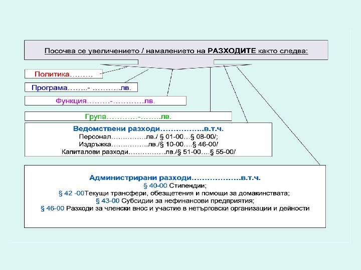 КЛАСИФИКАЦИЯ НА РАЗХОДИТЕ Ведомствени разходи, които имат пряко отношение към дейността на програмата и постигане на поставените цели Администрирани разходи по следните параграфи: § 40 -00 Стипендии; § 42 -00 Текущи трансфери, обезщетения и помощи за домакинства; § 43 -00 Субсидии за нефинансови предприятия; § 46 -00 Разходи за членски внос и участие в нетърговски организации и дейности