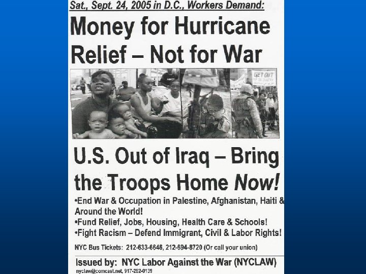 NO LOS REPATRIAREMOS Bush declaraba que no se repatriaría a las unidades de Iraq porque ya tenían suficientes tropas en casa. “no habrá un desplazamiento masivo de soldados norteamericanos apostados en Iraq y Afganistán para ayudar en los esfuerzos de recuperación de las zonas afectadas por el huracán". Teniente coronel Trey Cate, portavoz del ejército