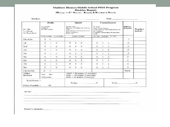 Trouble shooting Not checking out • When student does not checkout nor bring card back next day, give “ 0” points for the day • Coordinator asks what happened and reminds student to checkout • Teachers can prompt student to checkout