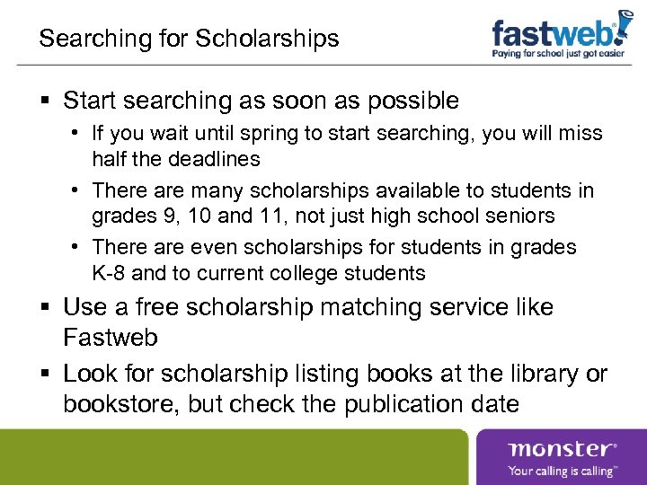 Searching for Scholarships § Start searching as soon as possible • If you wait until spring to start searching, you will miss half the deadlines • There are many scholarships available to students in grades 9, 10 and 11, not just high school seniors • There are even scholarships for students in grades K-8 and to current college students § Use a free scholarship matching service like Fastweb § Look for scholarship listing books at the library or bookstore, but check the publication date