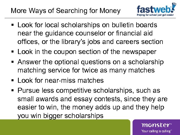 More Ways of Searching for Money § Look for local scholarships on bulletin boards near the guidance counselor or financial aid offices, or the library’s jobs and careers section § Look in the coupon section of the newspaper § Answer the optional questions on a scholarship matching service for twice as many matches § Look for near-miss matches § Pursue less competitive scholarships, such as small awards and essay contests, since they are easier to win, the money adds up and they help you win bigger scholarships