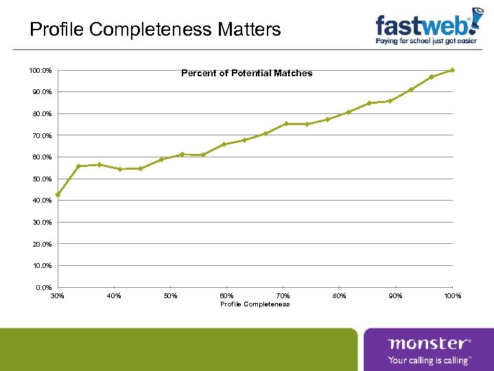 Profile Completeness Matters 100. 0% Percent of Potential Matches 90. 0% 80. 0% 70. 0% 60. 0% 50. 0% 40. 0% 30. 0% 20. 0% 10. 0% 30% 40% 50% 60% 70% Profile Completeness 80% 90% 100%