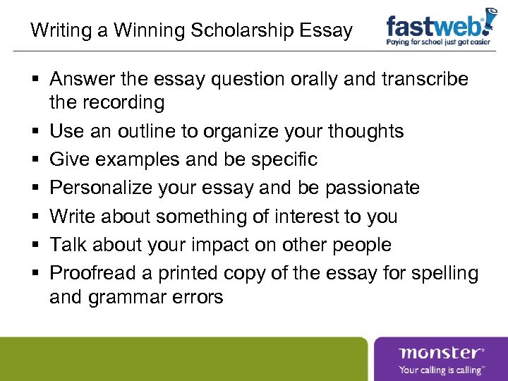 Writing a Winning Scholarship Essay § Answer the essay question orally and transcribe the recording § Use an outline to organize your thoughts § Give examples and be specific § Personalize your essay and be passionate § Write about something of interest to you § Talk about your impact on other people § Proofread a printed copy of the essay for spelling and grammar errors