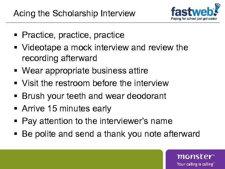 Acing the Scholarship Interview § Practice, practice § Videotape a mock interview and review the recording afterward § Wear appropriate business attire § Visit the restroom before the interview § Brush your teeth and wear deodorant § Arrive 15 minutes early § Pay attention to the interviewer’s name § Be polite and send a thank you note afterward