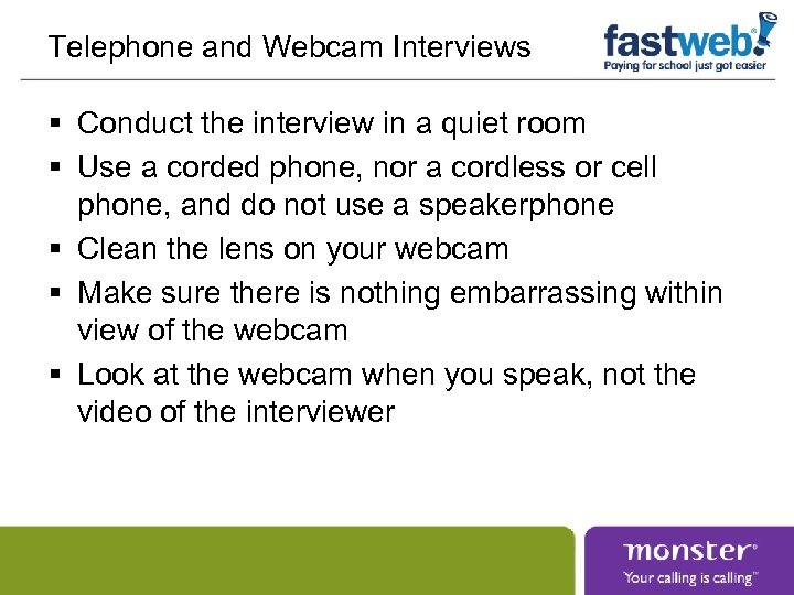 Telephone and Webcam Interviews § Conduct the interview in a quiet room § Use a corded phone, nor a cordless or cell phone, and do not use a speakerphone § Clean the lens on your webcam § Make sure there is nothing embarrassing within view of the webcam § Look at the webcam when you speak, not the video of the interviewer