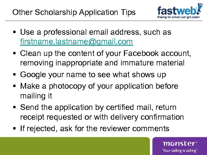 Other Scholarship Application Tips § Use a professional email address, such as firstname. lastname@gmail. com § Clean up the content of your Facebook account, removing inappropriate and immature material § Google your name to see what shows up § Make a photocopy of your application before mailing it § Send the application by certified mail, return receipt requested or with delivery confirmation § If rejected, ask for the reviewer comments
