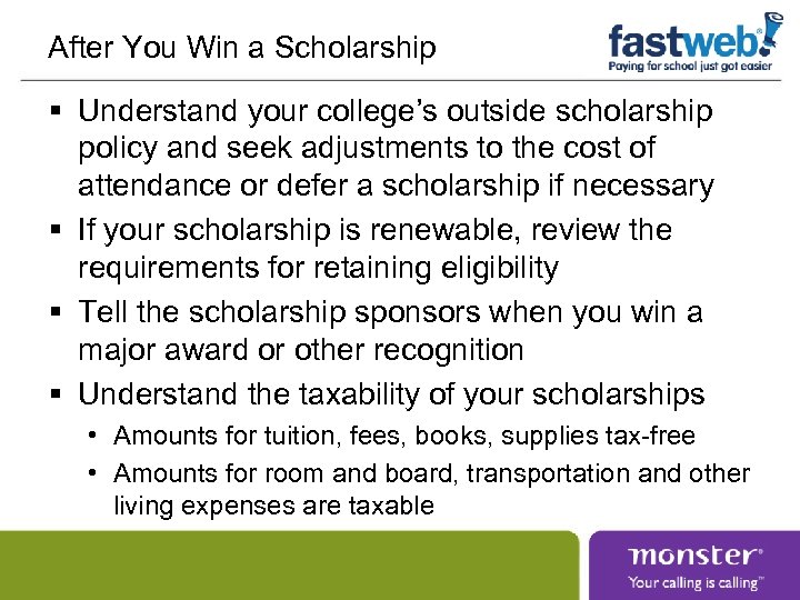 After You Win a Scholarship § Understand your college’s outside scholarship policy and seek adjustments to the cost of attendance or defer a scholarship if necessary § If your scholarship is renewable, review the requirements for retaining eligibility § Tell the scholarship sponsors when you win a major award or other recognition § Understand the taxability of your scholarships • Amounts for tuition, fees, books, supplies tax-free • Amounts for room and board, transportation and other living expenses are taxable