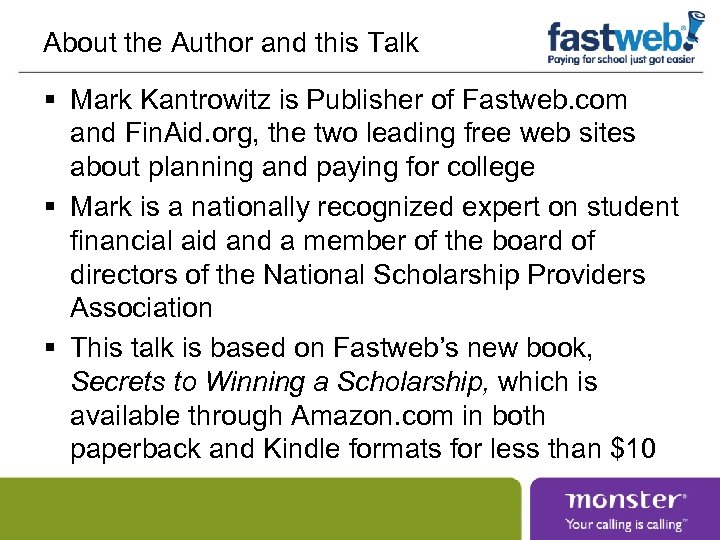 About the Author and this Talk § Mark Kantrowitz is Publisher of Fastweb. com and Fin. Aid. org, the two leading free web sites about planning and paying for college § Mark is a nationally recognized expert on student financial aid and a member of the board of directors of the National Scholarship Providers Association § This talk is based on Fastweb’s new book, Secrets to Winning a Scholarship, which is available through Amazon. com in both paperback and Kindle formats for less than $10