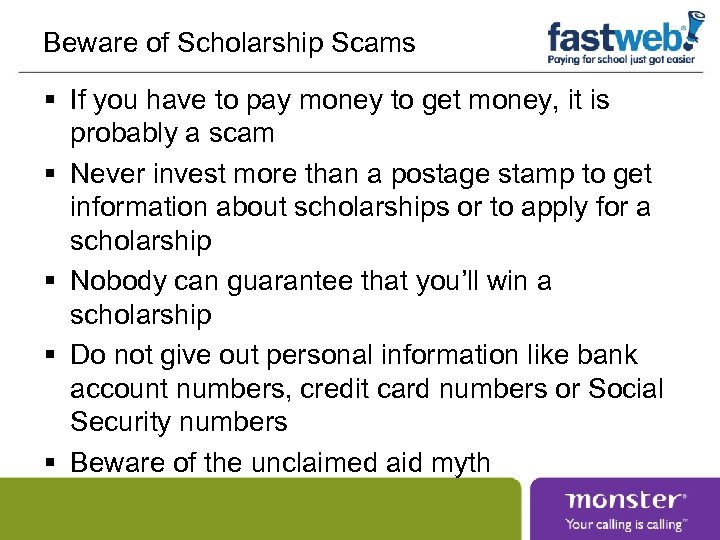 Beware of Scholarship Scams § If you have to pay money to get money, it is probably a scam § Never invest more than a postage stamp to get information about scholarships or to apply for a scholarship § Nobody can guarantee that you’ll win a scholarship § Do not give out personal information like bank account numbers, credit card numbers or Social Security numbers § Beware of the unclaimed aid myth