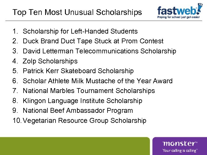 Top Ten Most Unusual Scholarships 1. Scholarship for Left-Handed Students 2. Duck Brand Duct Tape Stuck at Prom Contest 3. David Letterman Telecommunications Scholarship 4. Zolp Scholarships 5. Patrick Kerr Skateboard Scholarship 6. Scholar Athlete Milk Mustache of the Year Award 7. National Marbles Tournament Scholarships 8. Klingon Language Institute Scholarship 9. National Beef Ambassador Program 10. Vegetarian Resource Group Scholarship