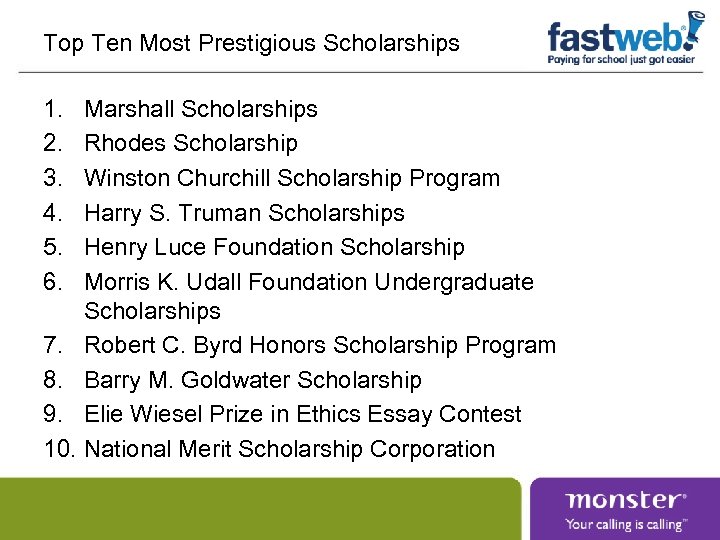 Top Ten Most Prestigious Scholarships 1. 2. 3. 4. 5. 6. Marshall Scholarships Rhodes Scholarship Winston Churchill Scholarship Program Harry S. Truman Scholarships Henry Luce Foundation Scholarship Morris K. Udall Foundation Undergraduate Scholarships 7. Robert C. Byrd Honors Scholarship Program 8. Barry M. Goldwater Scholarship 9. Elie Wiesel Prize in Ethics Essay Contest 10. National Merit Scholarship Corporation
