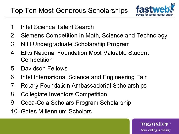 Top Ten Most Generous Scholarships 1. 2. 3. 4. Intel Science Talent Search Siemens Competition in Math, Science and Technology NIH Undergraduate Scholarship Program Elks National Foundation Most Valuable Student Competition 5. Davidson Fellows 6. Intel International Science and Engineering Fair 7. Rotary Foundation Ambassadorial Scholarships 8. Collegiate Inventors Competition 9. Coca-Cola Scholars Program Scholarship 10. Gates Millennium Scholars