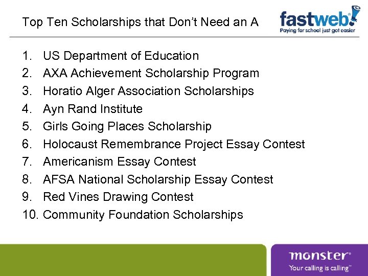 Top Ten Scholarships that Don’t Need an A 1. US Department of Education 2. AXA Achievement Scholarship Program 3. Horatio Alger Association Scholarships 4. Ayn Rand Institute 5. Girls Going Places Scholarship 6. Holocaust Remembrance Project Essay Contest 7. Americanism Essay Contest 8. AFSA National Scholarship Essay Contest 9. Red Vines Drawing Contest 10. Community Foundation Scholarships