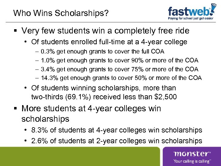 Who Wins Scholarships? § Very few students win a completely free ride • Of students enrolled full-time at a 4 -year college – – 0. 3% get enough grants to cover the full COA 1. 0% get enough grants to cover 90% or more of the COA 3. 4% get enough grants to cover 75% or more of the COA 14. 3% get enough grants to cover 50% or more of the COA • Of students winning scholarships, more than two-thirds (69. 1%) received less than $2, 500 § More students at 4 -year colleges win scholarships • 8. 3% of students at 4 -year colleges win scholarships • 2. 6% of students at 2 -year colleges win scholarships