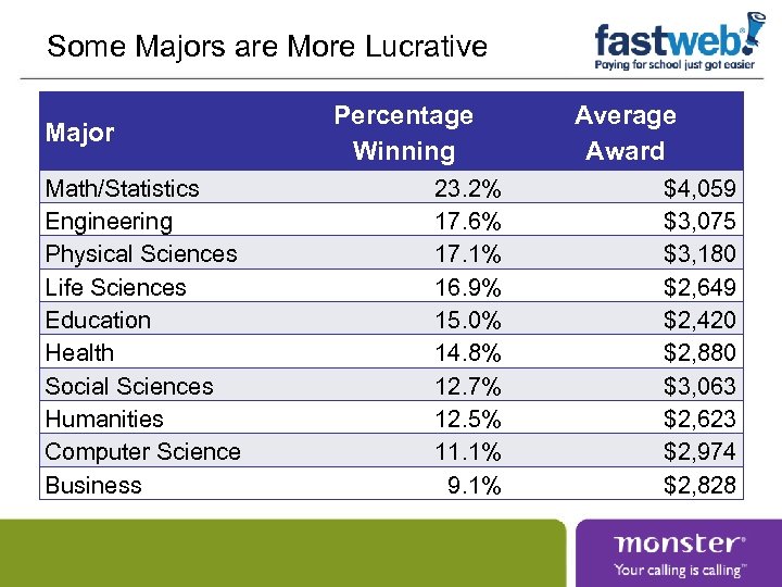 Some Majors are More Lucrative Major Math/Statistics Engineering Physical Sciences Life Sciences Education Health Social Sciences Humanities Computer Science Business Percentage Winning 23. 2% 17. 6% 17. 1% 16. 9% 15. 0% 14. 8% 12. 7% 12. 5% 11. 1% 9. 1% Average Award $4, 059 $3, 075 $3, 180 $2, 649 $2, 420 $2, 880 $3, 063 $2, 623 $2, 974 $2, 828