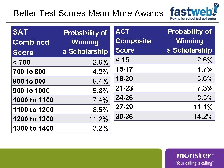 Better Test Scores Mean More Awards SAT Combined Score < 700 to 800 to 900 to 1000 to 1100 to 1200 to 1300 to 1400 Probability of Winning a Scholarship 2. 6% 4. 2% 5. 4% 5. 8% 7. 4% 8. 5% 11. 2% 13. 2% ACT Composite Score < 15 15 -17 18 -20 21 -23 24 -26 27 -29 30 -36 Probability of Winning a Scholarship 2. 6% 4. 7% 5. 6% 7. 3% 8. 3% 11. 1% 14. 2%