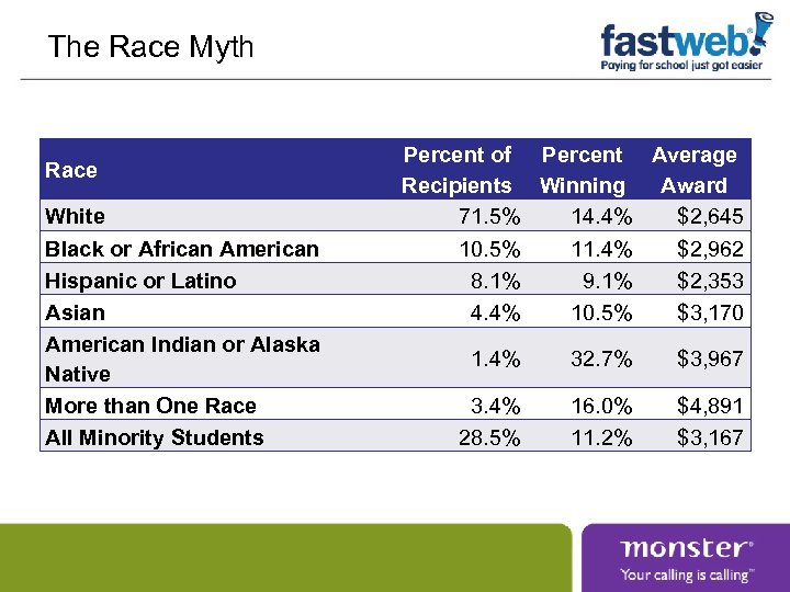 The Race Myth Race White Black or African American Hispanic or Latino Asian American Indian or Alaska Native More than One Race All Minority Students Percent of Percent Average Recipients Winning Award 71. 5% 14. 4% $2, 645 10. 5% 11. 4% $2, 962 8. 1% 9. 1% $2, 353 4. 4% 10. 5% $3, 170 1. 4% 32. 7% $3, 967 3. 4% 28. 5% 16. 0% 11. 2% $4, 891 $3, 167