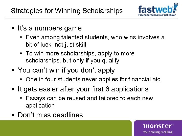Strategies for Winning Scholarships § It’s a numbers game • Even among talented students, who wins involves a bit of luck, not just skill • To win more scholarships, apply to more scholarships, but only if you qualify § You can’t win if you don’t apply • One in four students never applies for financial aid § It gets easier after your first 6 applications • Essays can be reused and tailored to each new application § Don’t miss deadlines
