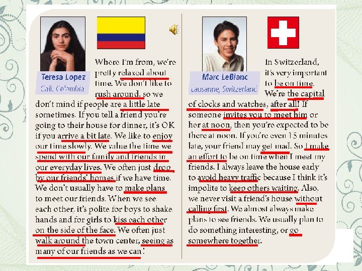 3 b Read again and complete the chart. Ideas and customs about being on time Colombia Switzerland it’s OK to be late it’s important to be on time visiting a friend’s house drop by our friends’ homes if we have time always call first making plans with friends don’t usually make plans