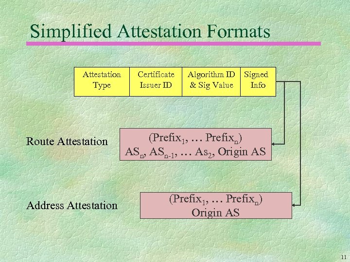 Two Types of Attestations An Address Attestation (AA) is issued by the “owner” of one or more prefixes (a subscriber or an ISP), to identify the first (origin) AS authorized to advertise the prefixes A Route Attestation (RA) is issued by a router on behalf of an AS (ISP), to authorize neighbor ASes to use the route in the UPDATE containing the RA These data structures share the same basic format 10