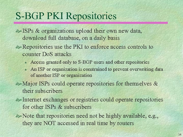 Housekeeping for S-BGP Every S-BGP router needs access to all the certificates, CRLs, and address attestations so that it can verify any RA These data items don’t belong in UPDATE messages S-BGP uses replicated, loosely synchronized repositories to make this data available to ISPs and organizations The repository data is downloaded by ISP/organization Network Operation Centers (NOCs) for processing l l l Each NOC validates retrieved certificates, CRLs, & AAs, then downloads an extracted file with the necessary data to routers Avoids need for routers to perform this computationally intensive processing Permits a NOC to override problems that might arise in distributing certificates and AAs, but without affecting other ISPs 13