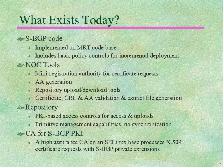 What Exists Today? S-BGP code l l Implemented on MRT code base Includes basic policy controls for incremental deployment NOC Tools l l Mini-registration authority for certificate requests AA generation Repository upload/download tools Certificate, CRL & AA validation & extract file generation Repository l l PKI-based access controls for access & uploads Primitive management capabilities, no synchronization CA for S-BGP PKI l A high assurance CA on an SELinux base processes X. 509 certificate requests with S-BGP private extensions 17