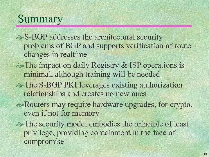 Summary S-BGP addresses the architectural security problems of BGP and supports verification of route changes in realtime The impact on daily Registry & ISP operations is minimal, although training will be needed The S-BGP PKI leverages existing authorization relationships and creates no new ones Routers may require hardware upgrades, for crypto, even if not for memory The security model embodies the principle of least privilege, providing containment in the face of compromise 18