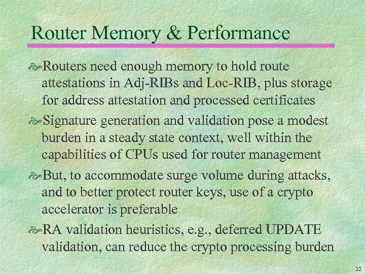 Deploying S-BGP Router software must implement S-BGP Router hardware must have appropriate storage & digital signature processing capabilities Registries must assume CA responsibilities for address prefixes and AS # allocation ISPs and subscribers that execute BGP must upgrade routers, must act as CAs, and must interact with repositories to exchange PKI & AA data 21